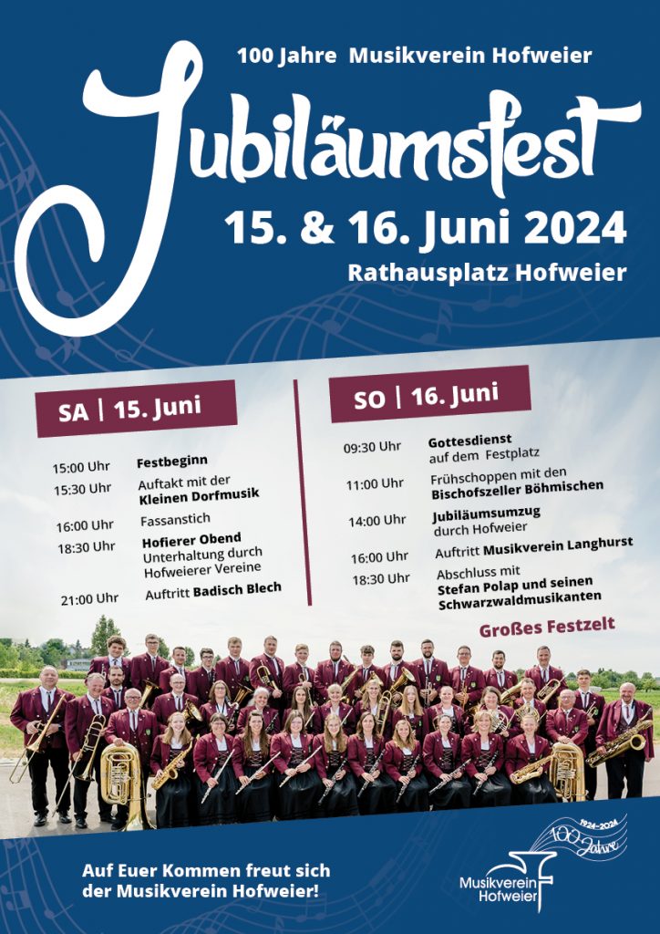 Wir laden Sie herzlich ein, gemeinsam mit dem Musikverein Hofweier ein Jahrhundert voller Musik, Tradition und Gemeinschaft zu feiern! Anlässlich unseres großen Jubiläumsfestes, das am 15. und 16. Juni 2024 auf dem festlich geschmückten Rathausplatz in Hofweier stattfindet, erwartet Sie ein unvergessliches Wochenende voller Blasmusik.